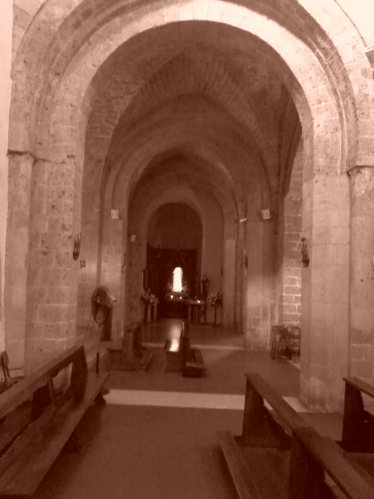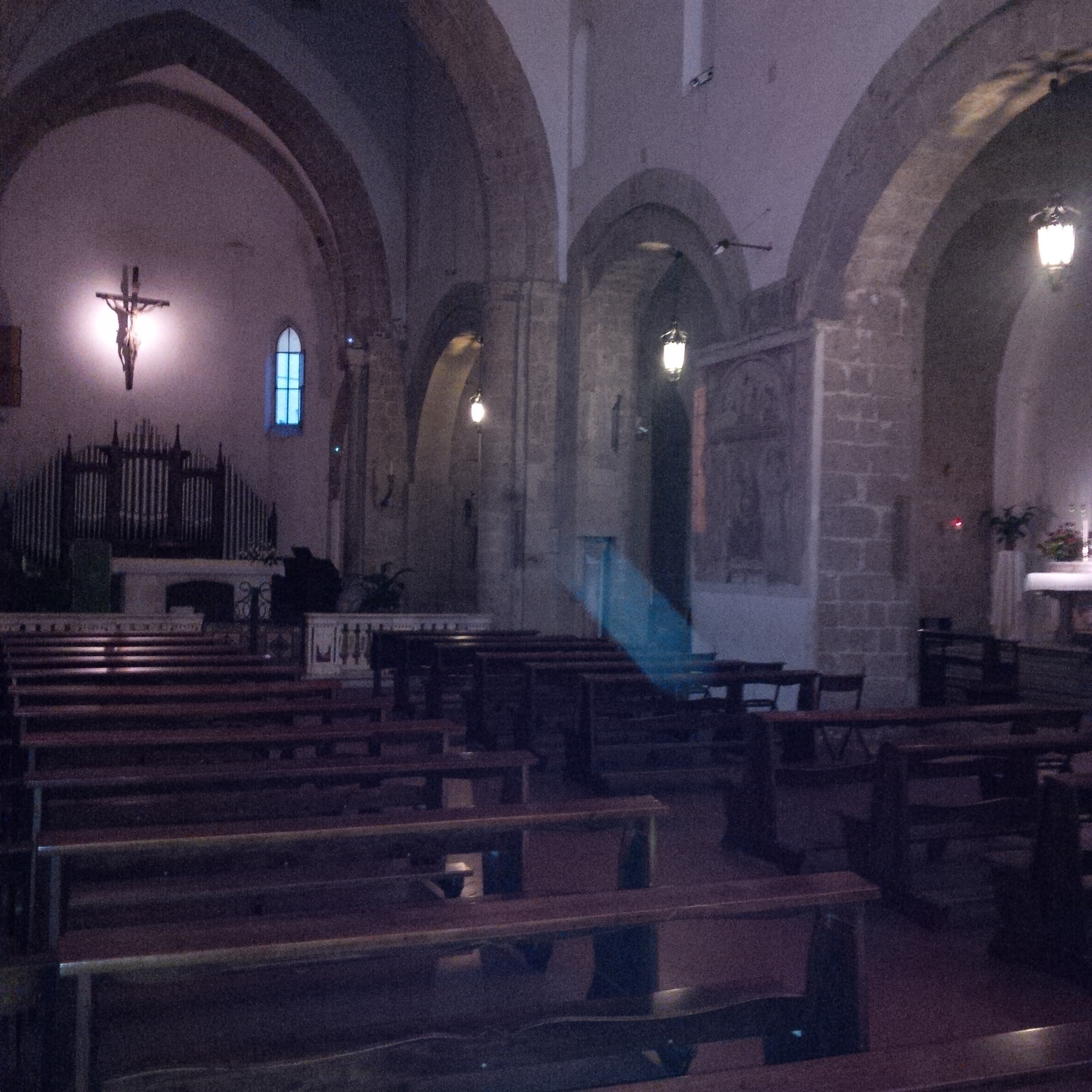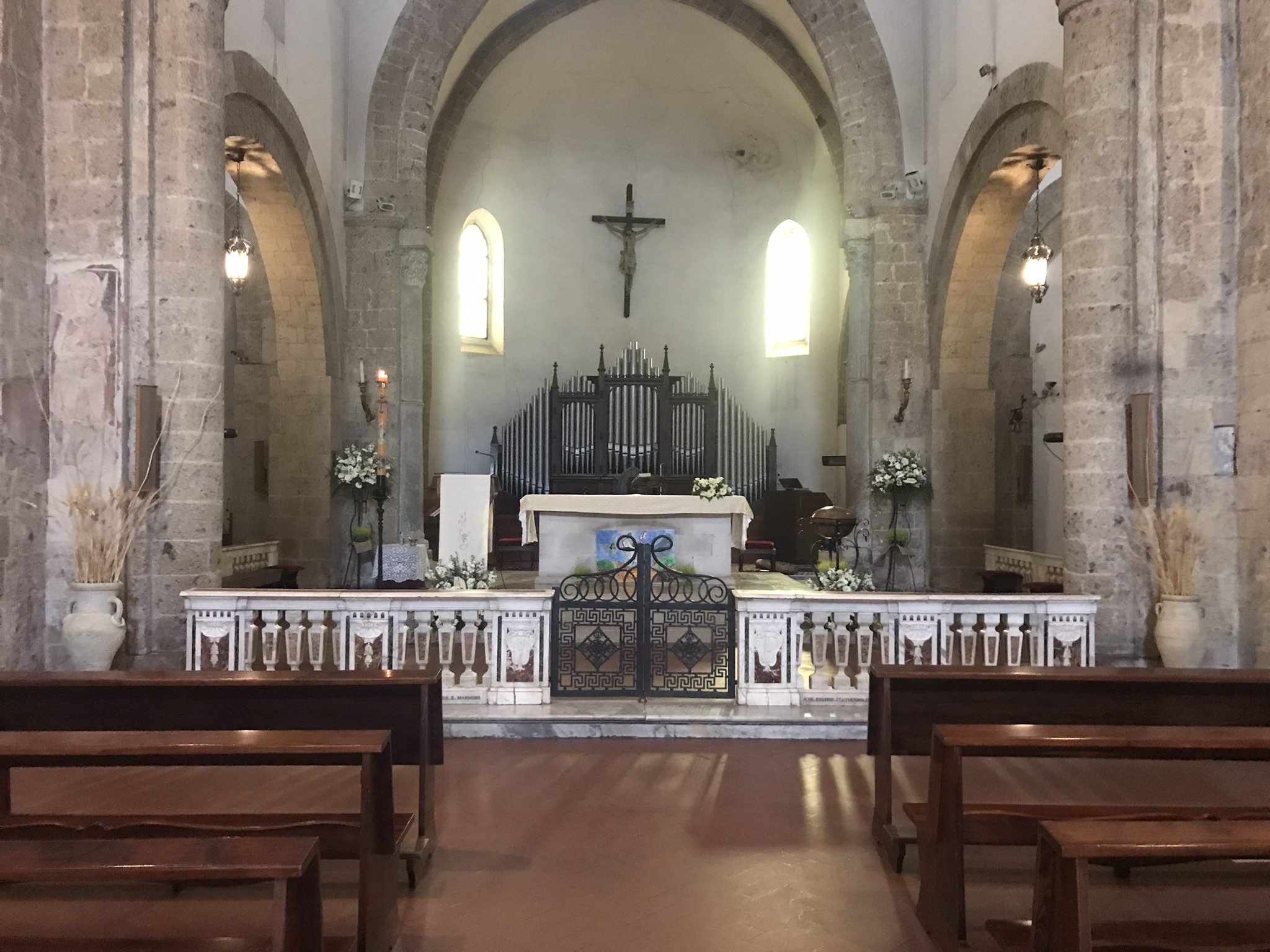 A seguito della trasformazione della pianta quadrata in una pianta rettangolare a tre navate, presenta una facciata più ampia, in tufo a vista con tre portali di forma ogivale, di cui quello centrale con sulla volta il simbolo dell’Agnus Dei.